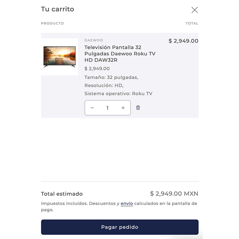 Haz clic en el icono del carrito para revisar tu selección. Aquí puedes actualizar cantidades o eliminar productos si lo deseas. Cuando estés listo, haz clic en "Pagar pedido".