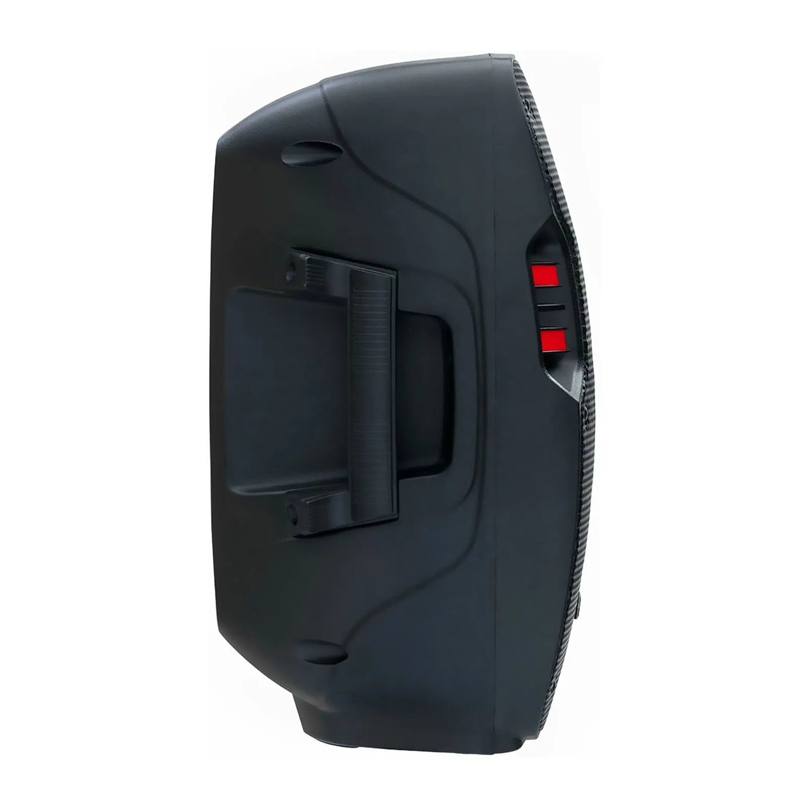 Display, controles de reproducción y perillas independientes de volumen general y micrófono, graves, agudos y eco. Funciones: prioridad de audio, radio FM, luz multicolor, asas laterales.