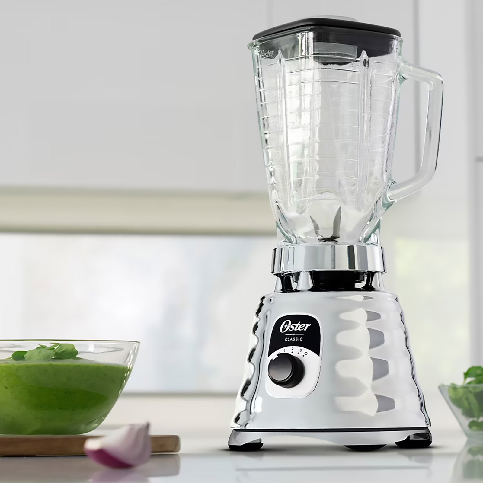 Licuadora clásica Oster en cromo, reinventada y modernizada con perilla, te brinda una experiencia aún mejor. Su potente motor 6 veces más duradero con 1000 W de potencia, vaso de vidrio refractario Boroclass resistente a ingredientes hirviendo, acople metálico 10 veces más fuerte, junto con su revolucionaria cuchilla trituradora de hielo te ayudan a preparar deliciosas y saludables recetas.