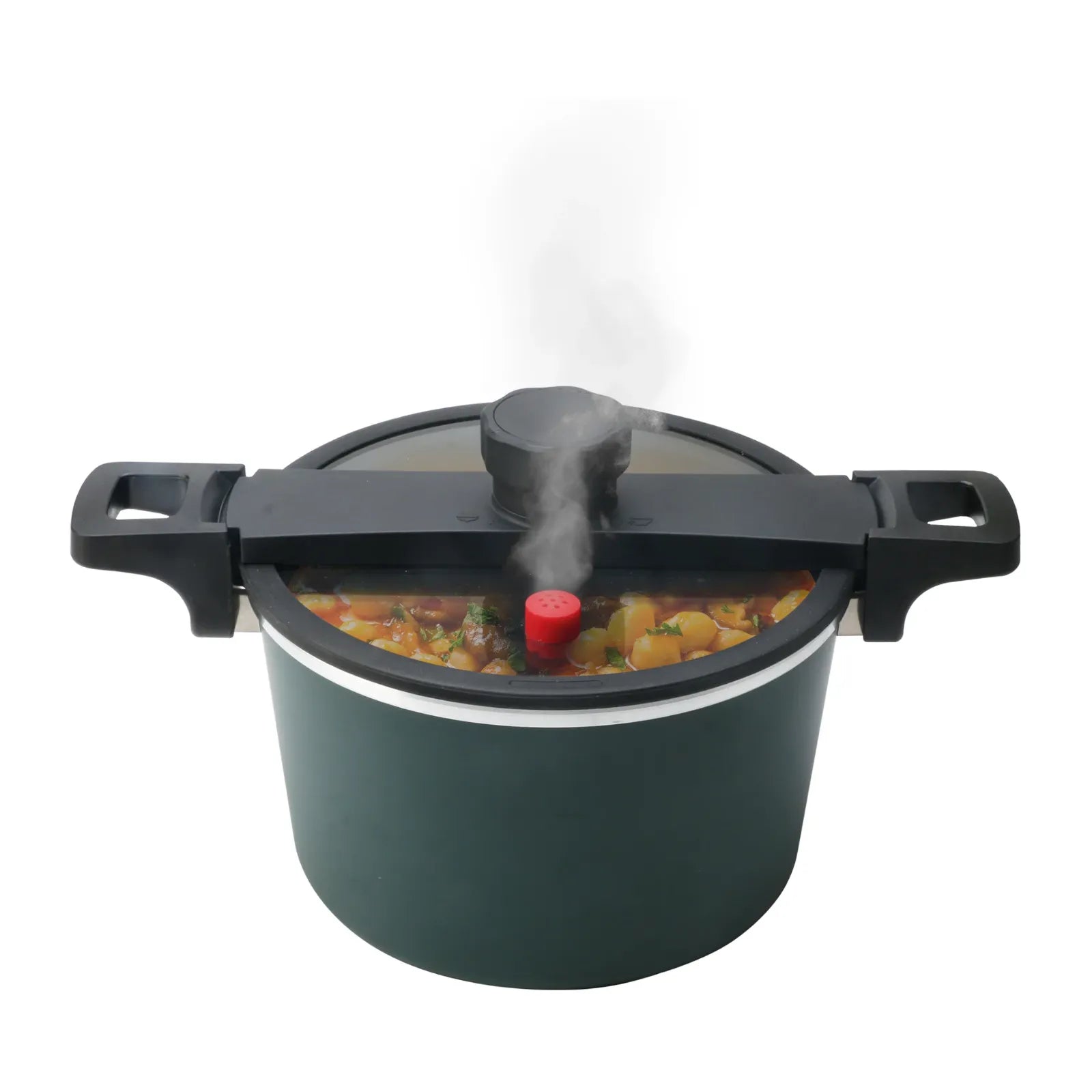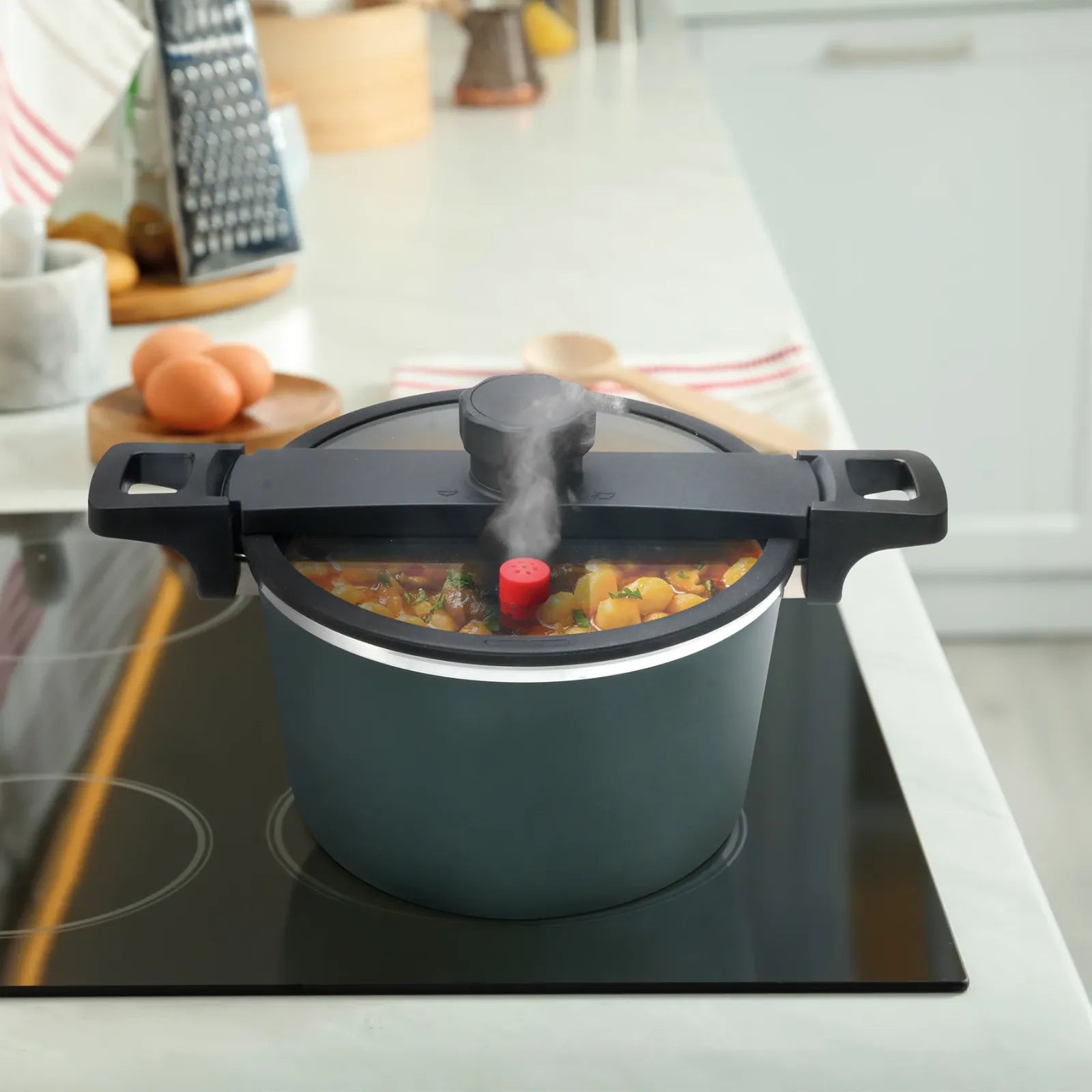 La tapa de vidrio templado soporta altas temperaturas y, junto con el sistema de cerrado seguro y bloqueo total, garantiza una cocción sin fugas. Compatible con estufas de gas, eléctricas y parrillas de inducción, ofrece una flexibilidad inigualable.