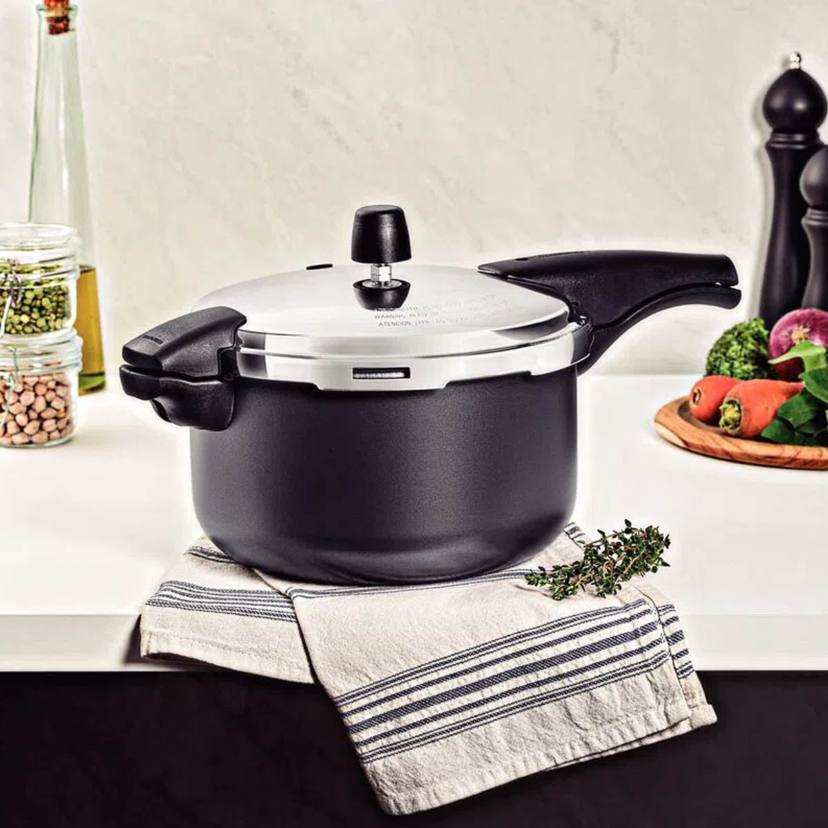 ¡Si quiere hacer las cosas bien en la cocina sin dejar de lado la practicidad, la olla de presión Tramontina Vancouver en aluminio con revestimiento interno y externo antiadherente Starflon Max Grafito de 24 centímetros de diámetro y 6 litros es la elección correcta! Su cuerpo está producido en aluminio con revestimiento interno y externo en antiadherente Starflon Max. Gracias a estas características, se facilita la limpieza y evita que los alimentos se peguen en la superficie. Para su protección, posee tres válvulas de seguridad y cuenta con mangos y asa en baquelita antitérmica, un material que reduce la propagación del calor y permite un manejo mucho más confortable y seguro. ¡Una pieza de color grafito que transformará su cocina y le garantizará mayor practicidad a su rutina!