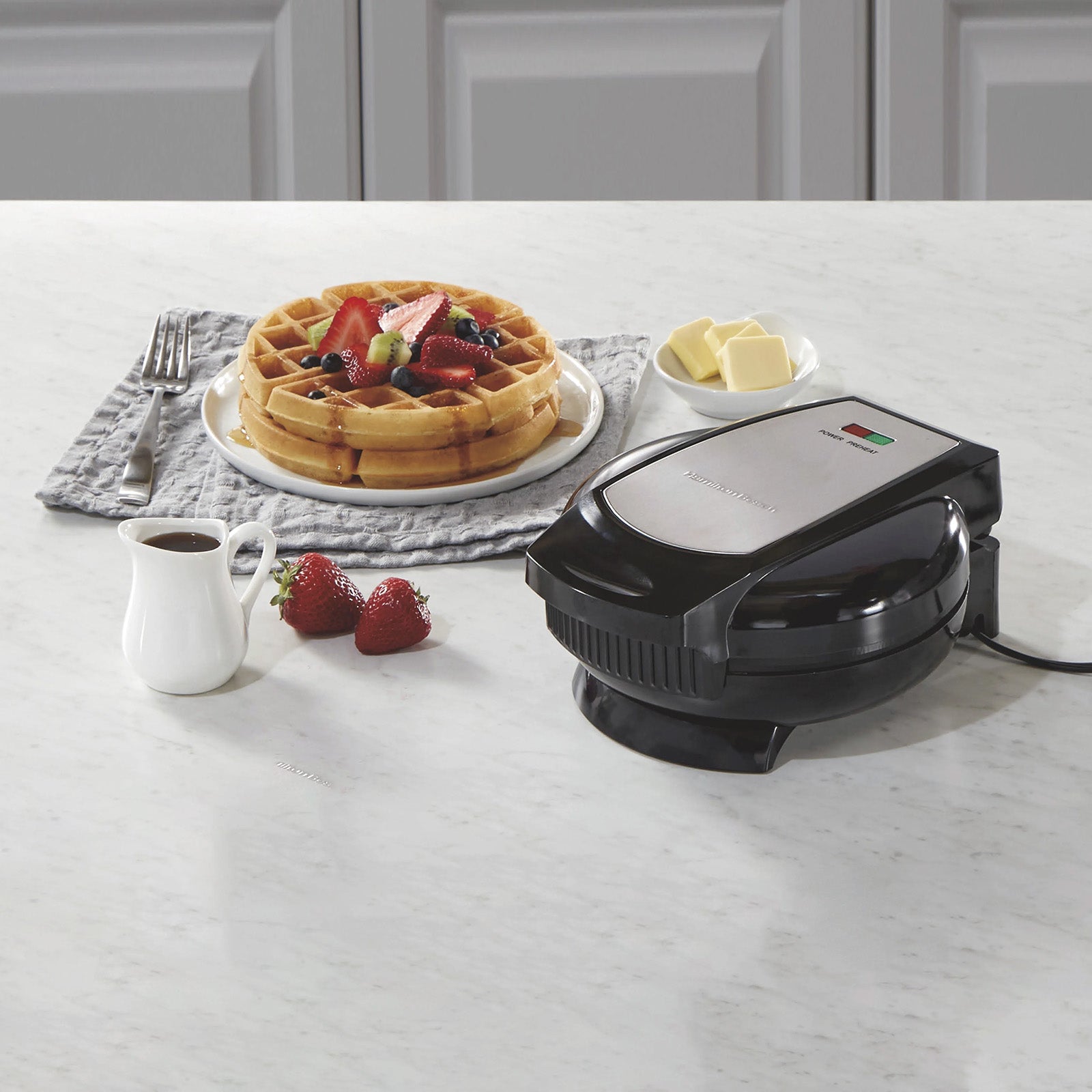 Con la Waflera Hamilton Beach, puedes crear auténticos waffles belgas en casa. Es tan rápido y fácil como enchufar la máquina de waffles, esperar la luz verde de precalentamiento, agregar la masa y cerrar la tapa.